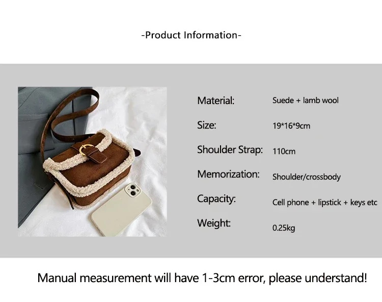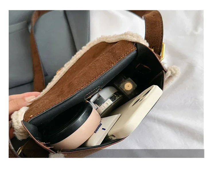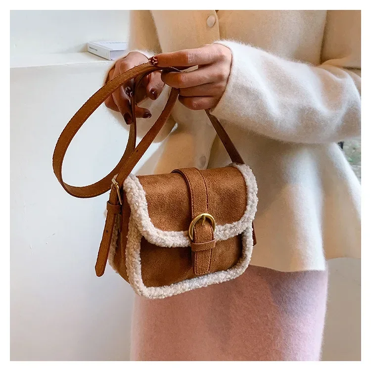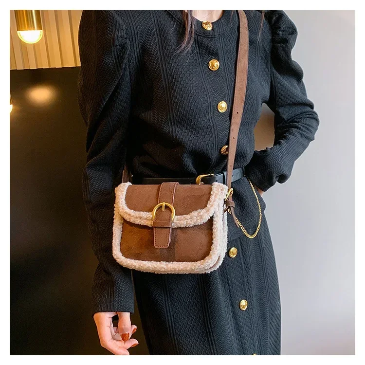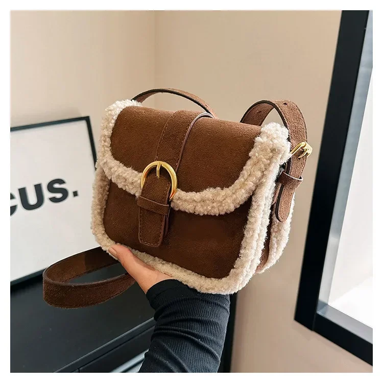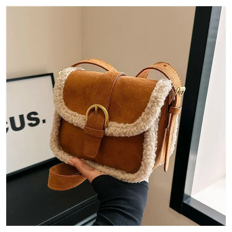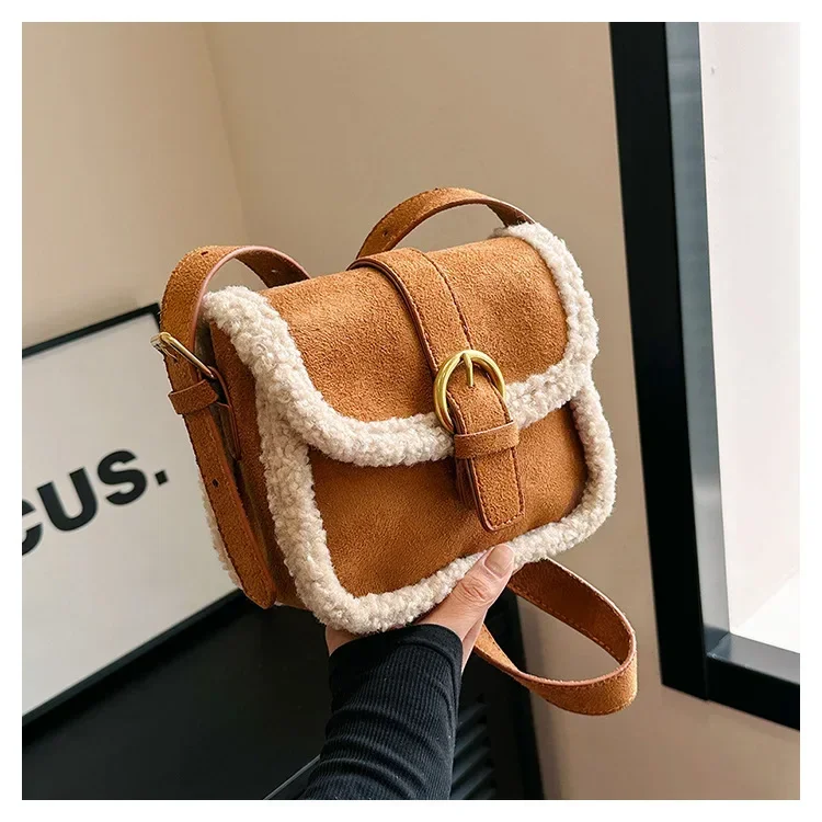 Autumn Winter Plush Bag Women's Korean Retro Small Square Handbags New Suede Lamb Wool Patchwork Shoulder Crossbody Bags