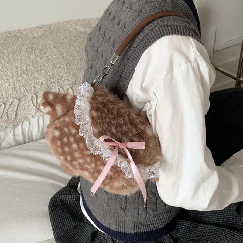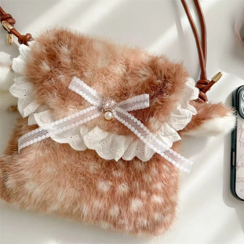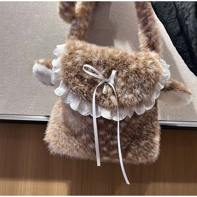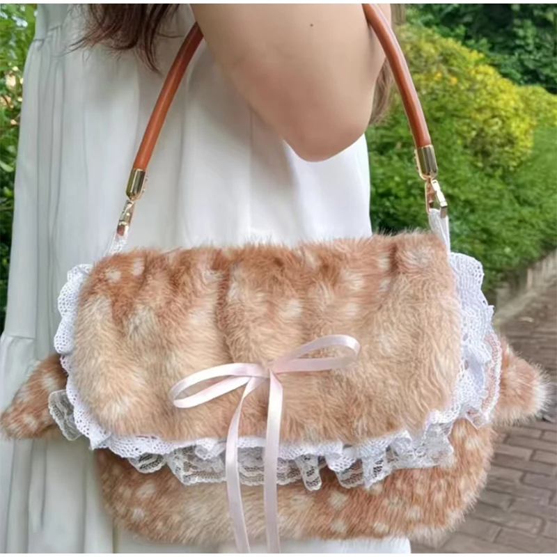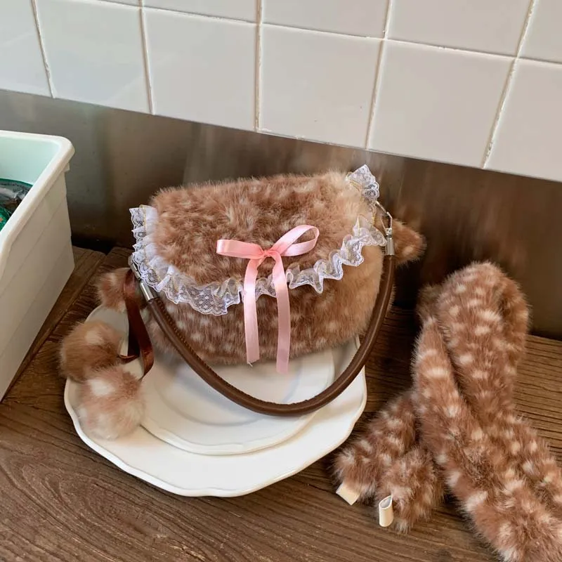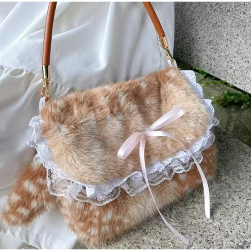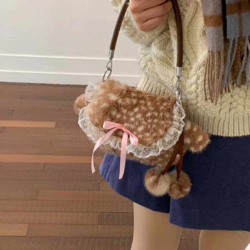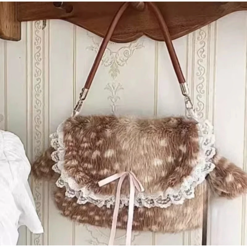 Lolita Plush Handbag Cute Lace & Bow Decor Faux Fur Shoulder Bag Vintage Brown Top-handle Bag Spotted Deer Pattern Underarm Bag