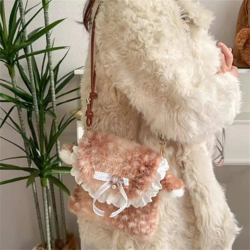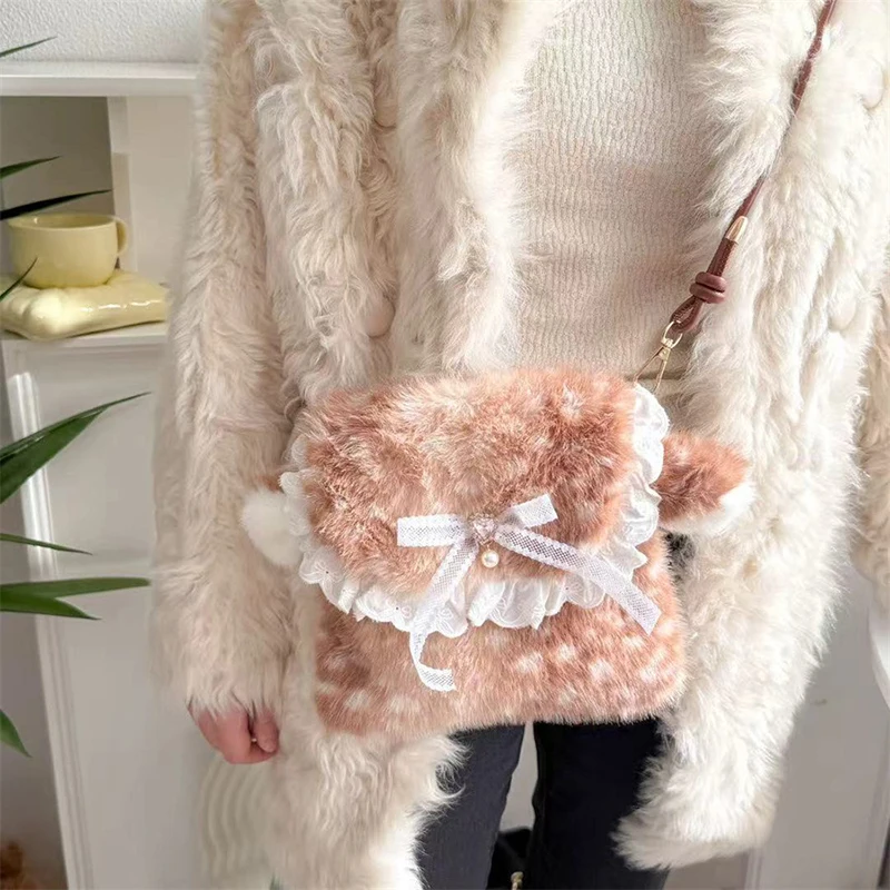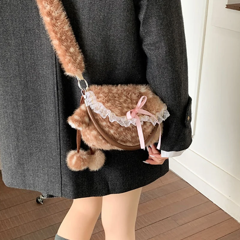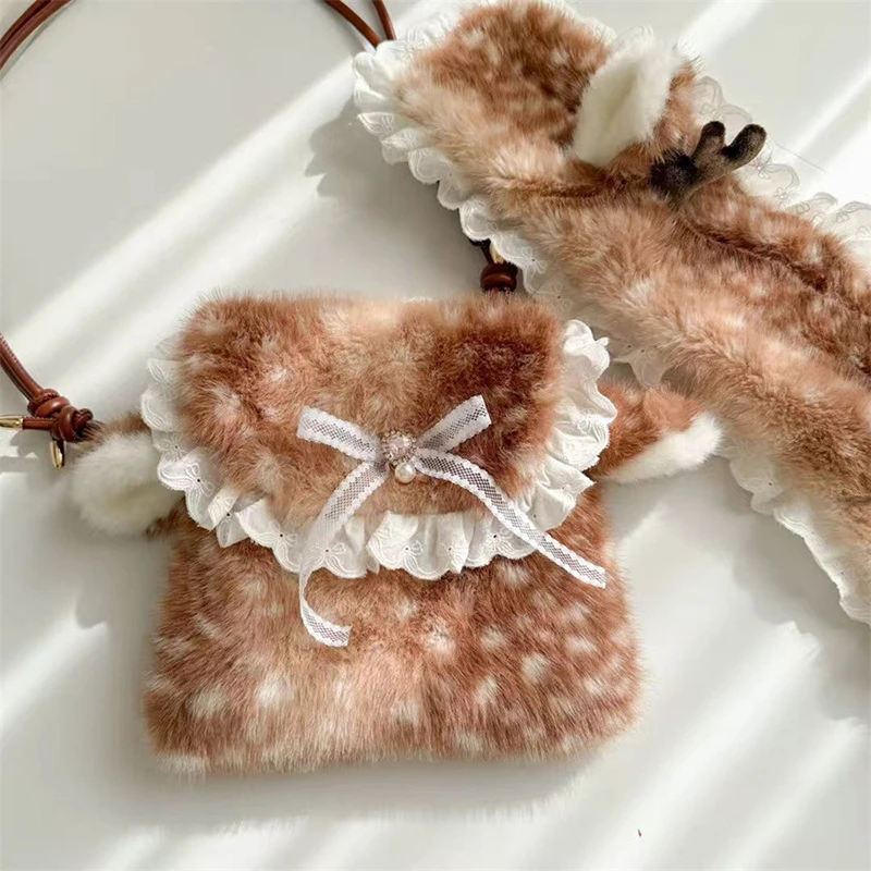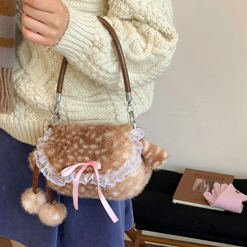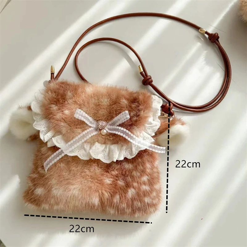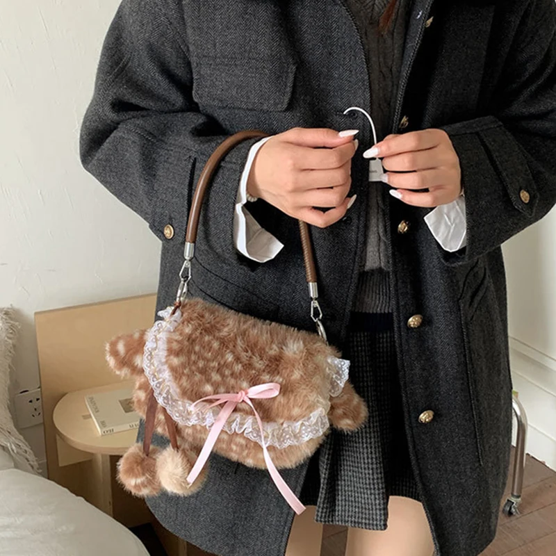 Lolita Plush Handbag Cute Lace & Bow Decor Faux Fur Shoulder Bag Vintage Brown Top-handle Bag Spotted Deer Pattern Underarm Bag