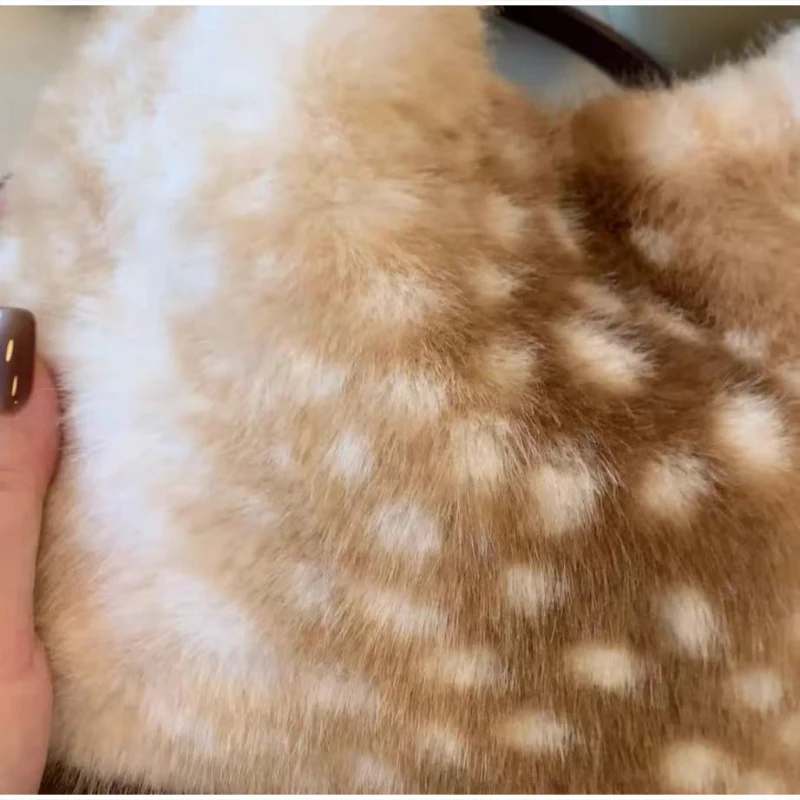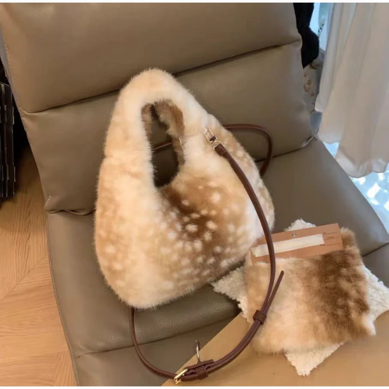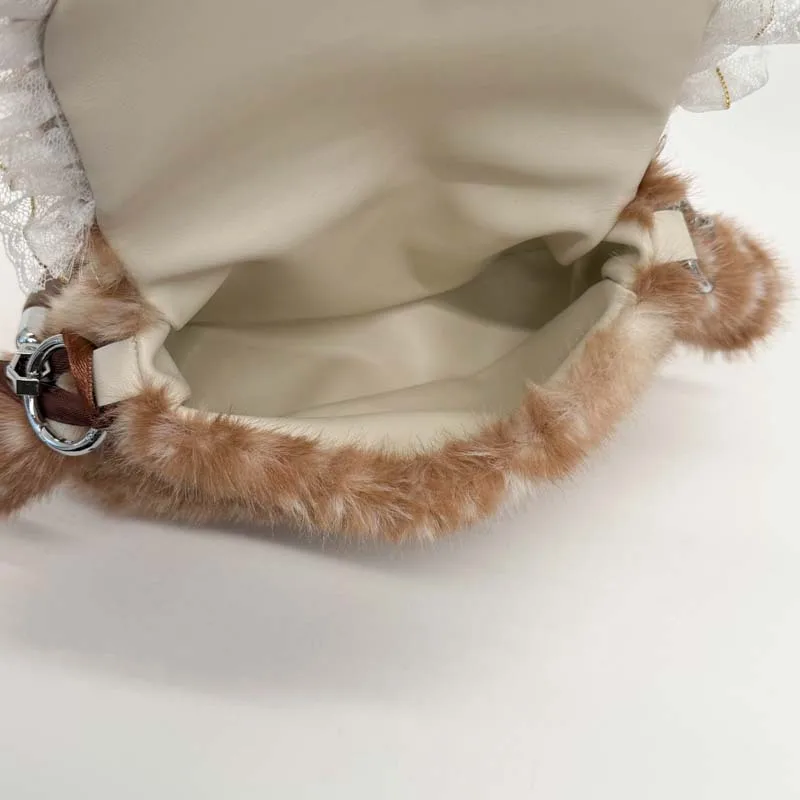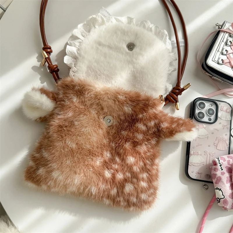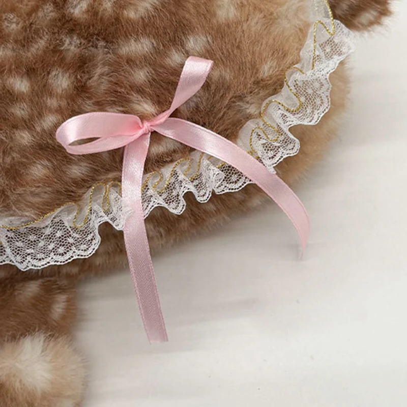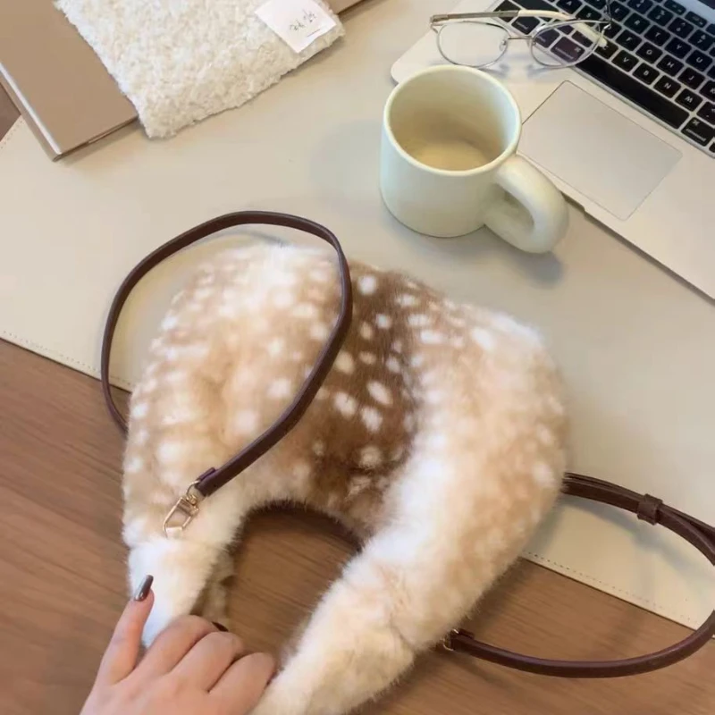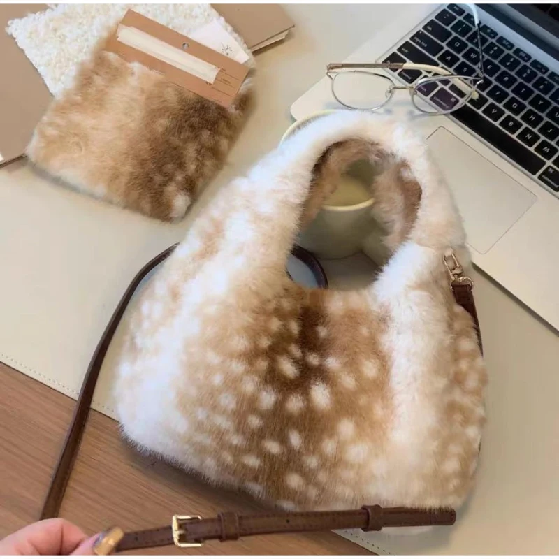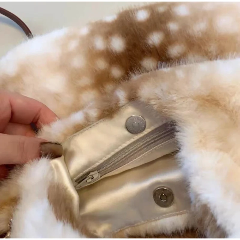 Lolita Plush Handbag Cute Lace & Bow Decor Faux Fur Shoulder Bag Vintage Brown Top-handle Bag Spotted Deer Pattern Underarm Bag